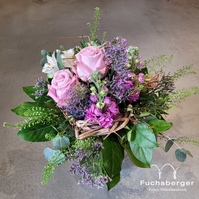 Stimmiger Strauß mit saisonalen Blüten in Rosa, Lila, Weiß und Grün