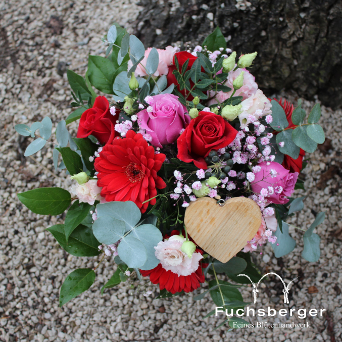 Ein schöner Valentinsgruß mit Dekoherz in Rot, Pink und Rosa mit etwas Grün.