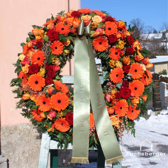 Rundgesteckter Kranz mit saisonalen Blüten in Orange und Rot (auf Wunsch auch gerne in anderen Farben)