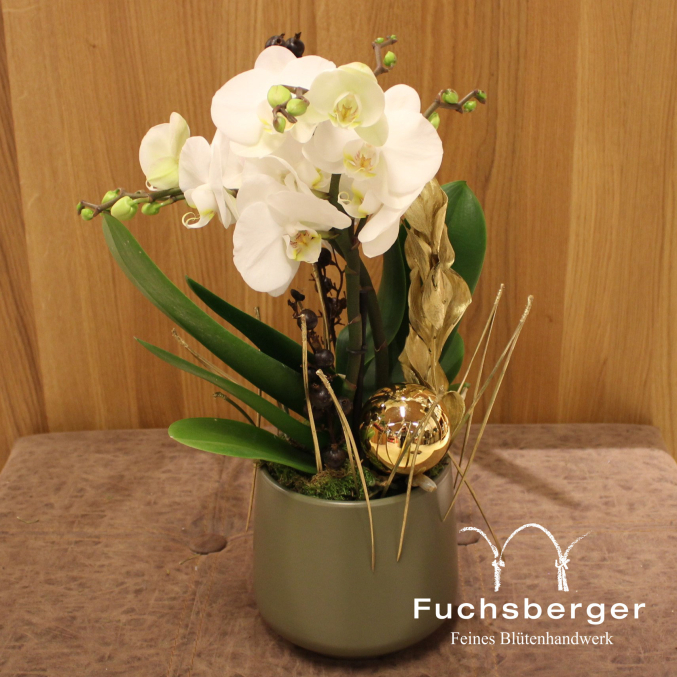 Weiße Orchidee im Übertopf (Beispielbild), weihnachtlich dekoriert.